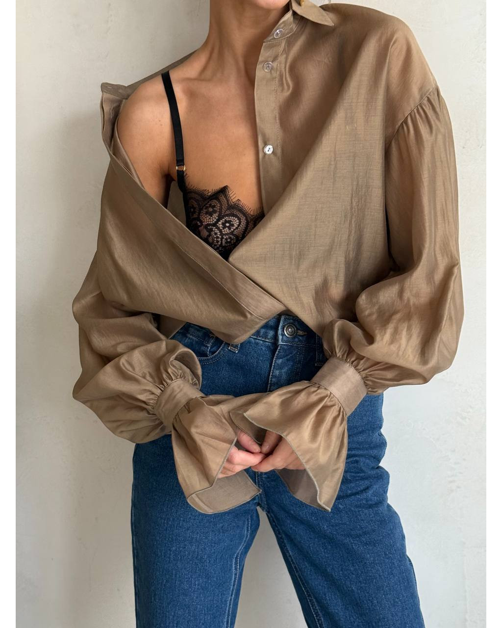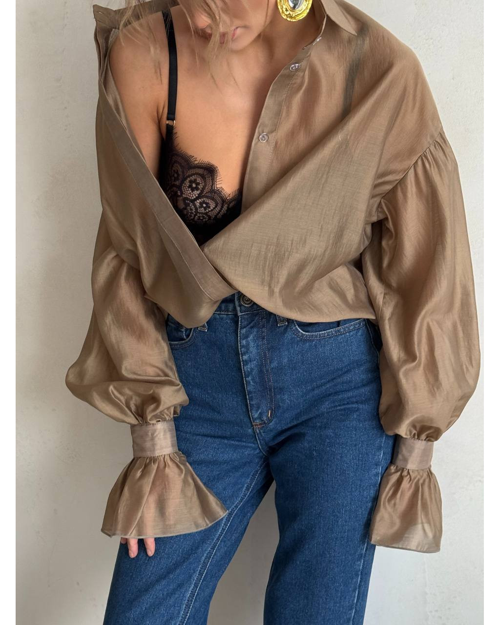 Cămașă oversized din tencel, cu design modern și croială lejeră, ce oferă un look sofisticat și effortless. Mânecile voluminoase și manșetele largi adaugă un plus de eleganță, iar materialul fin și fluid cade perfect pe corp.