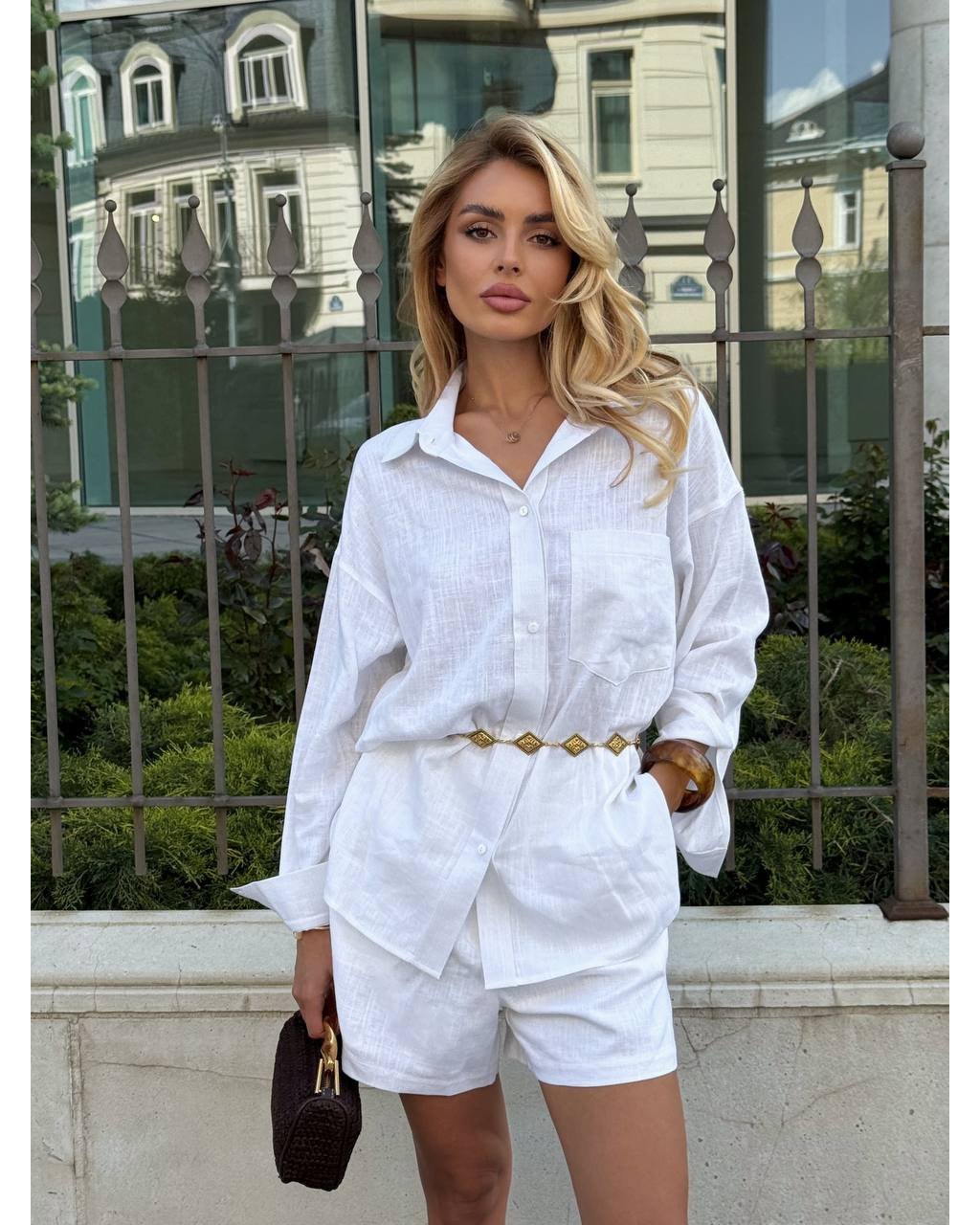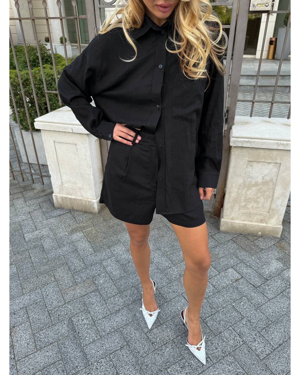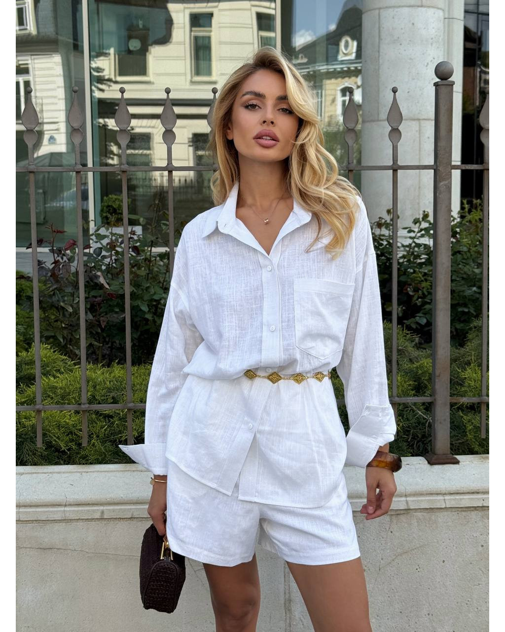 Cămașa oversize poate fi purtată atât lejer, cât și legată în talie pentru un efect modern și feminin. Pantalonii scurți completează outfitul printr-o croială curată, ușor de asortat.
