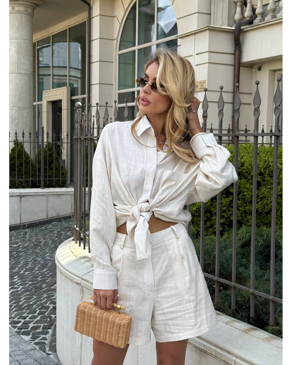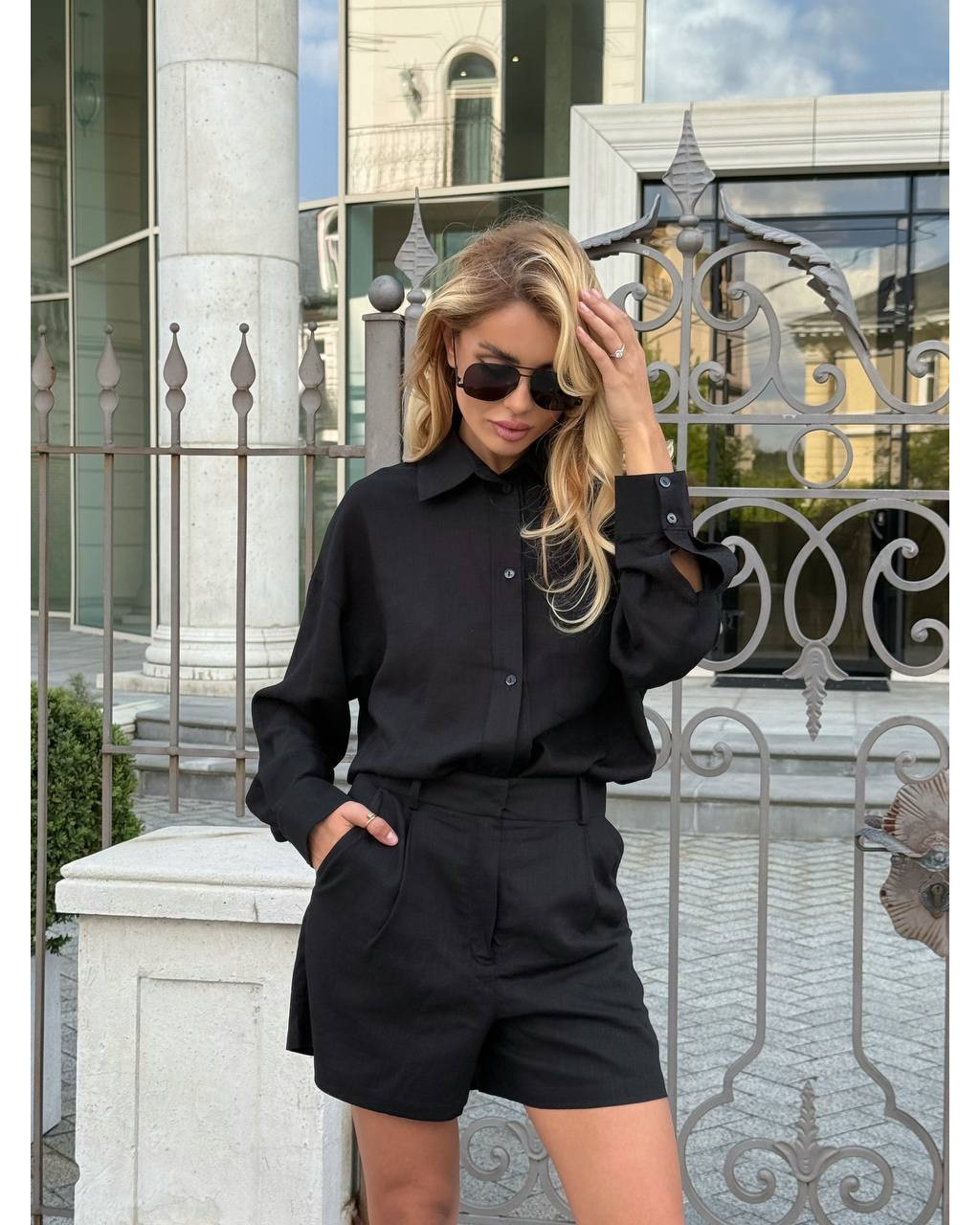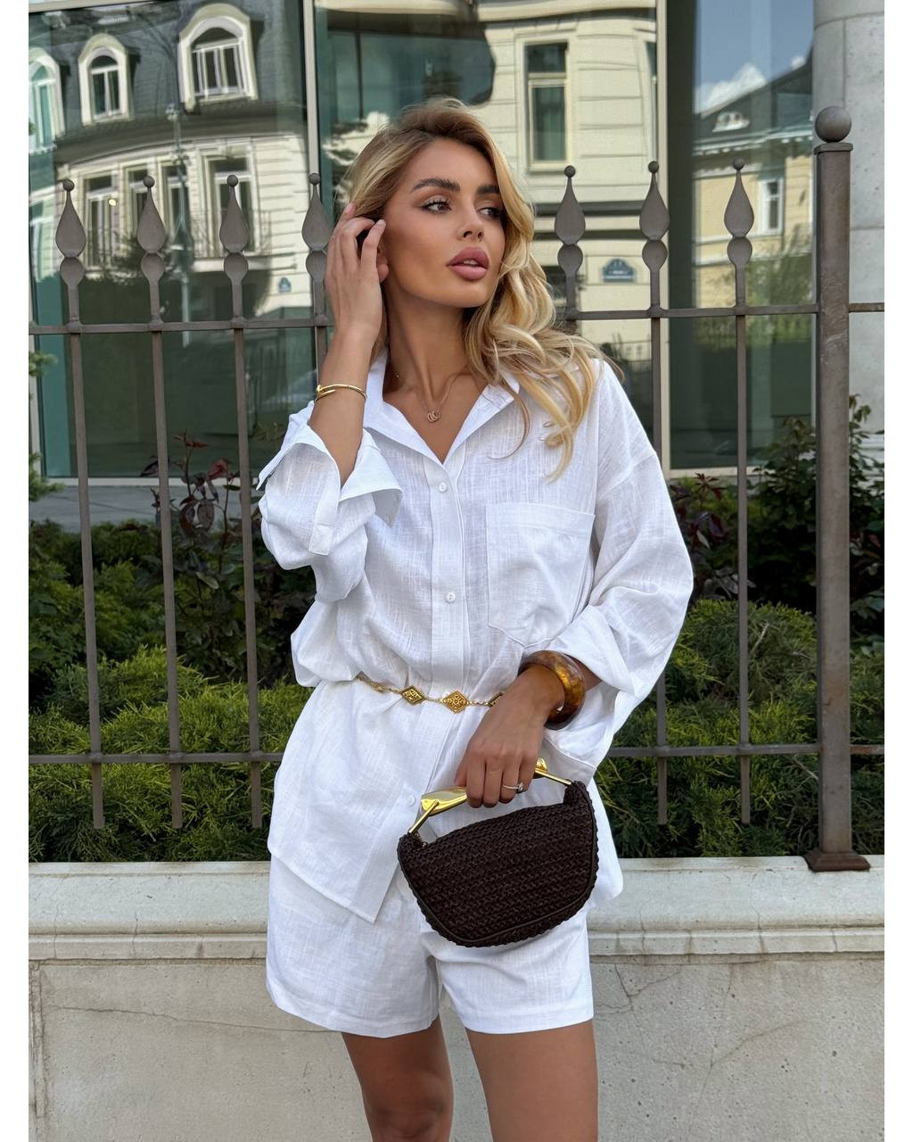 Cămașa oversize poate fi purtată atât lejer, cât și legată în talie pentru un efect modern și feminin. Pantalonii scurți completează outfitul printr-o croială curată, ușor de asortat.