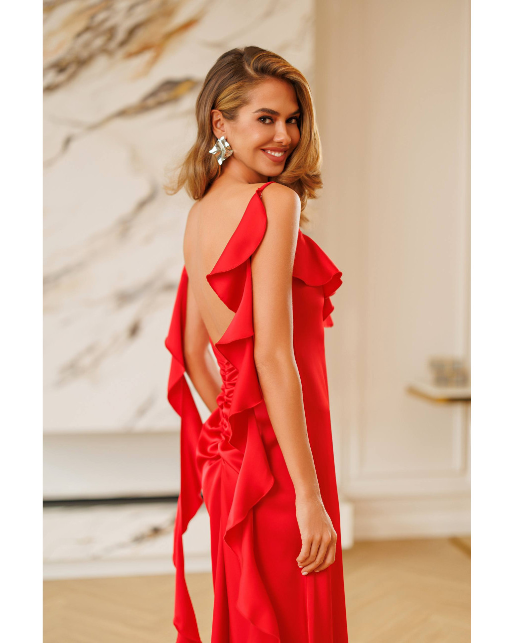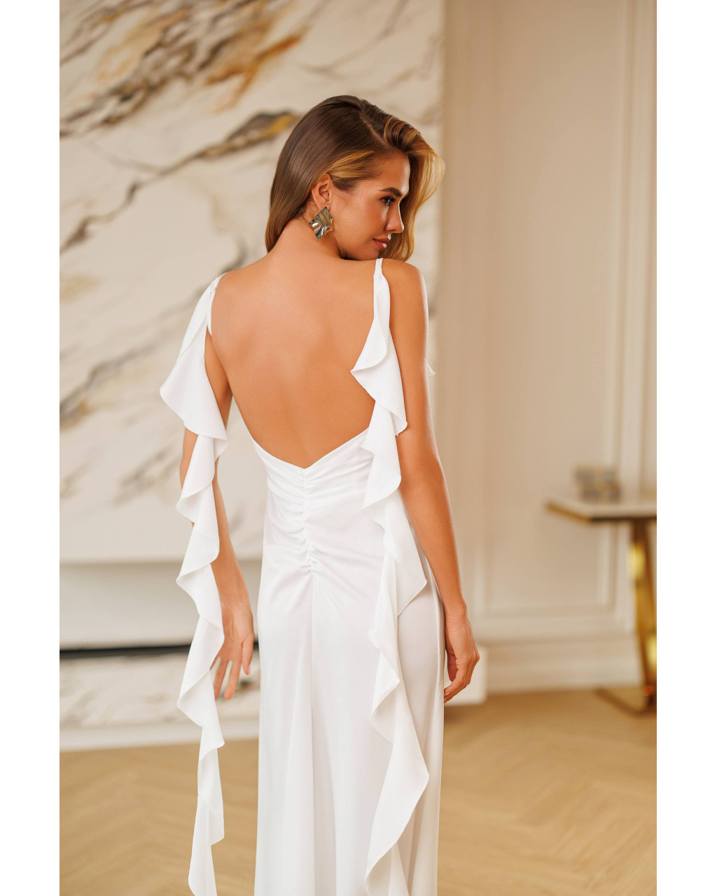 Designul cu volane delicate și spatele ușor decupat oferă un aer sofisticat, fiind ideală pentru evenimente, nunți, botezuri sau seri speciale.