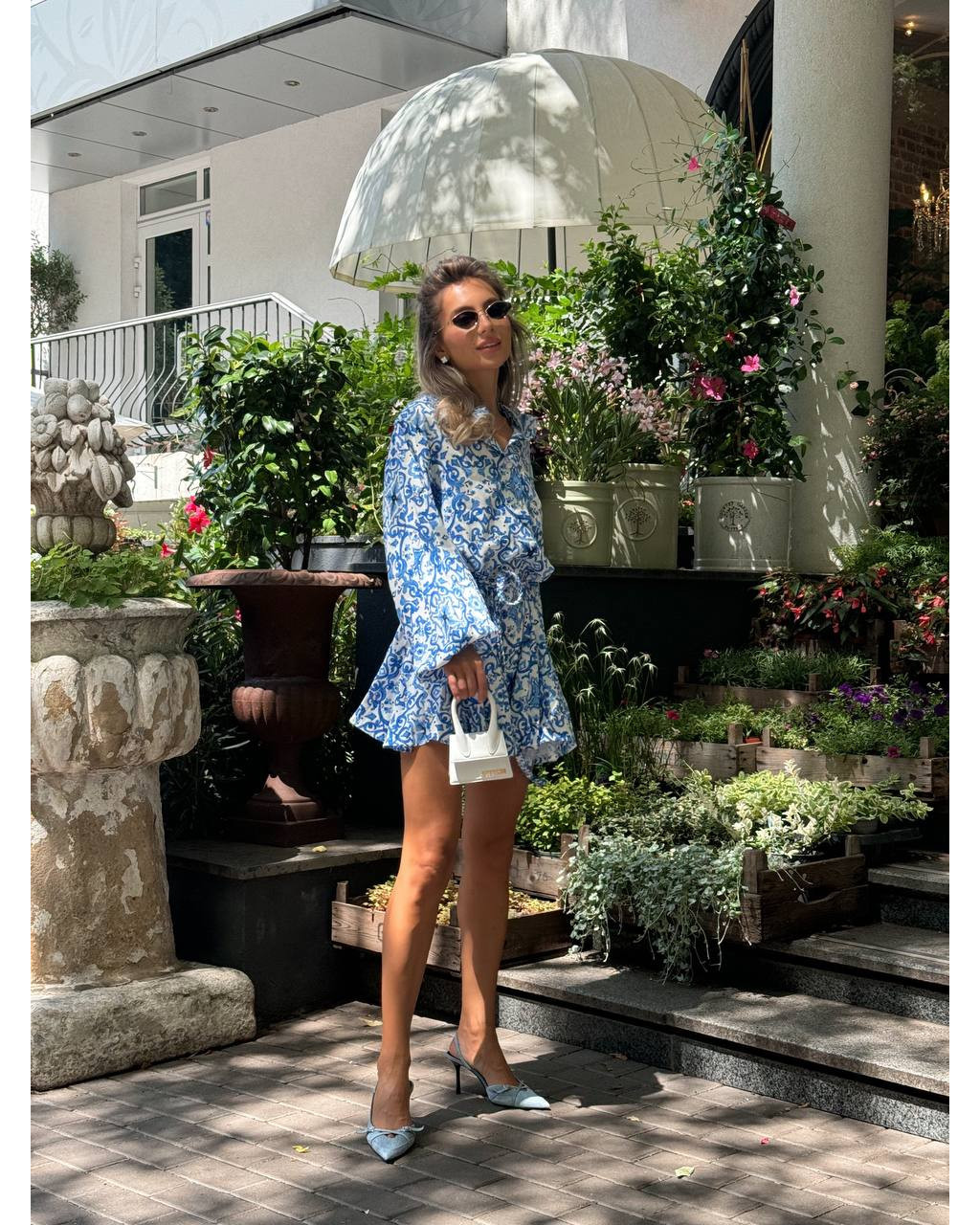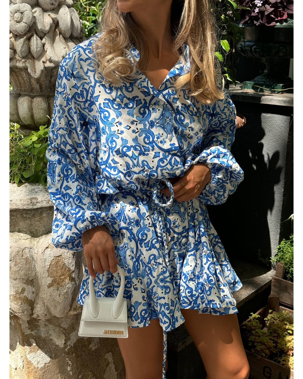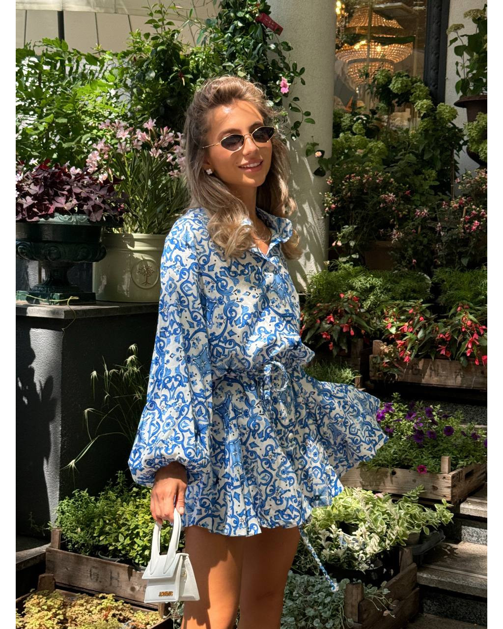 Rochie tip cămașă din bumbac, cu imprimeu albastru inspirat din stil mediteranean și croială lejeră, ce oferă un look fresh și elegant. Mânecile voluminoase și talia reglabilă evidențiază silueta, păstrând în același timp confortul.